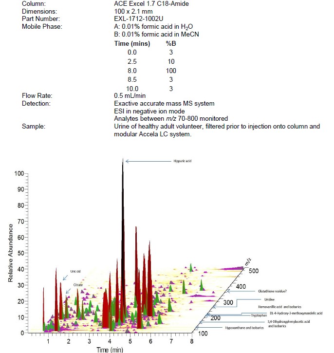 針對(duì)不同酸堿性的化合物,ACE設(shè)計(jì)了三款HILIC柱(A,B和N),實(shí)現(xiàn)不同的選擇性。比如: