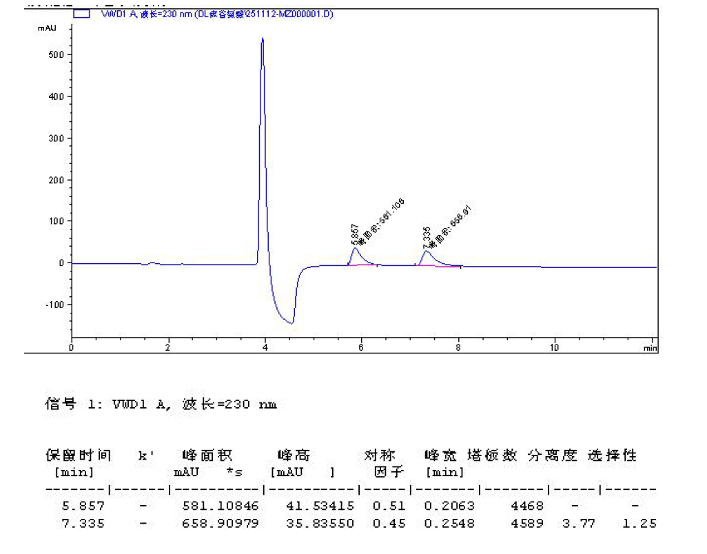 色譜柱:Chiral MZ(2) 5μm 250×4.6 mm 貨號(hào):FMG-AC5-B02-NFC 流速:0.8mL/min 檢測(cè):UV230nm 樣品濃度:1 mg/mL 進(jìn)樣量:2 μ 流動(dòng)相:咨詢